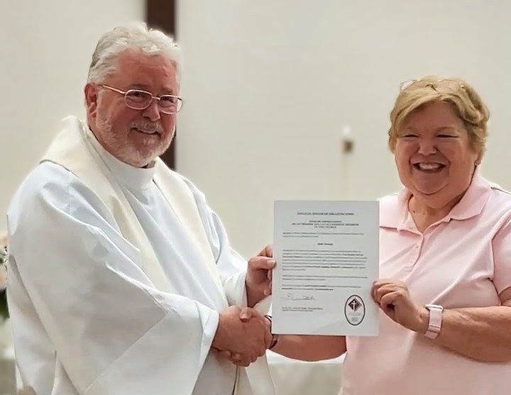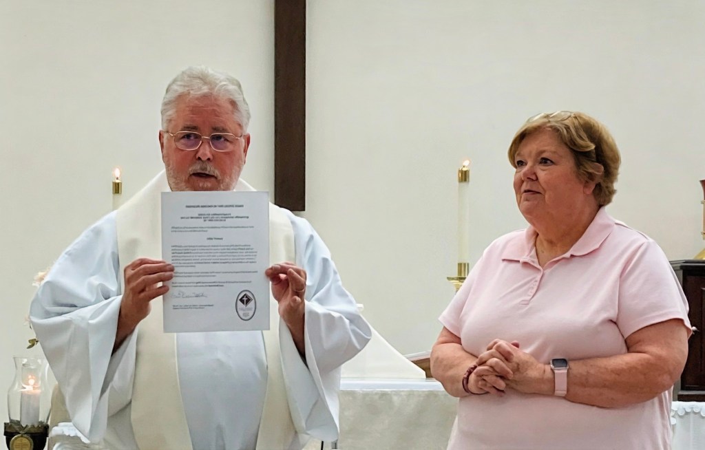 Father Stan had the pleasure this Sunday of presenting Julie with a license (from the Bishop himself!) to act as Eucharistic Minister.